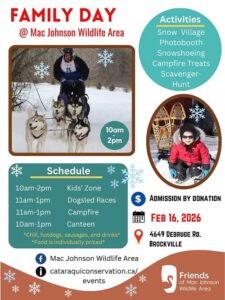 Join the Friends of Mac Johnson Wildlife Area in Brockville for their annual Family Day Winter Festival Monday February 16th from 10am to 2pm. Lots of family friendly activities – snow village, photo booth, snowshoeing, campfire treats, scavenger hunt, canteen and much more. The Mush LaRose Dog Sled teams are back and always a highlight of the day. Admission is by donation.Schedule:
