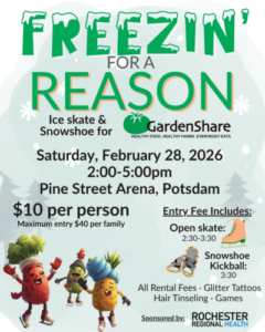 Admission is $10 per person, with a maximum entry fee of $40 per family. Each admission includes: one hour of open skate, snowshoe rentals, activities including glitter tattoos and hair tinseling, and a fun game of snowshoe kickball for those that are interested! All proceeds benefit GardenShare’s continued work to promote local food access and food security right in St. Lawrence County.