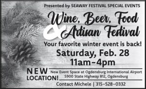 The Seaway Festival Events Wine, Beer, Food and Artisan Festival is back on Saturday Feb 28th 11-4 at a new location, the new event space at the Ogdensburg International Airport! Want to be a vendor? Call Michelle 315-528-0332!