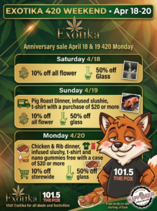 Monday, 4/20 Chicken & Rib dinner, infused slushy, t-shirt and nano gummies – free with a purchase of $20 or more. 10% off storewide 50% off glass.