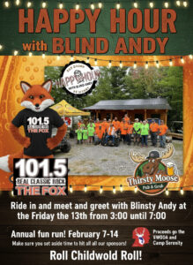 The Thirsty Moose Pub & Grub host a great afternoon as Blind Andy does his show at The Thirsty Moose Pub & Grub. Food and refreshments are available.Their is a $2,000 anonymous gift to Camp Serenity for the Ride In. This anonymous donator challenges; you, your club, your organization, your business to meet or beat this $2,000 donation. If you are willing to take part in this challenge come to The Thirsty Moose Ride In the Friday or contact www.snopackerschikdwold@gmail.com