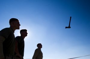 A tomahawk, a hatchet traditionally used by Native Americans as a weapon and utility tool, flies through the air after being thrown as US Marines from 1st Battalion, 8th Marines, Bravo company look on during downtime at new Mirage patrol base, Musa Qala District, Helmand province on February 7, 2011. There are around 140,000 international troops, two-thirds of them from the United States, in Afghanistan fighting the militant Islamist Taliban. AFP PHOTO / DMITRY KOSTYUKOV (Photo credit should read DMITRY KOSTYUKOV/AFP/Getty Images)
